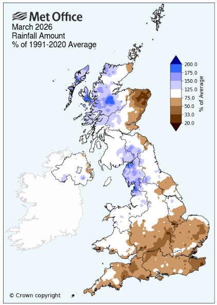 The overall figures do hide regional variability with England generally the driest in the UK, recording 17% less rainfall than the March average. There was also a pronounced north–south split, with northern England seeing 14% above average and southern England 37% below. Catchments in East Anglia received low rainfall ranging from 42 – 85% of average for the month.