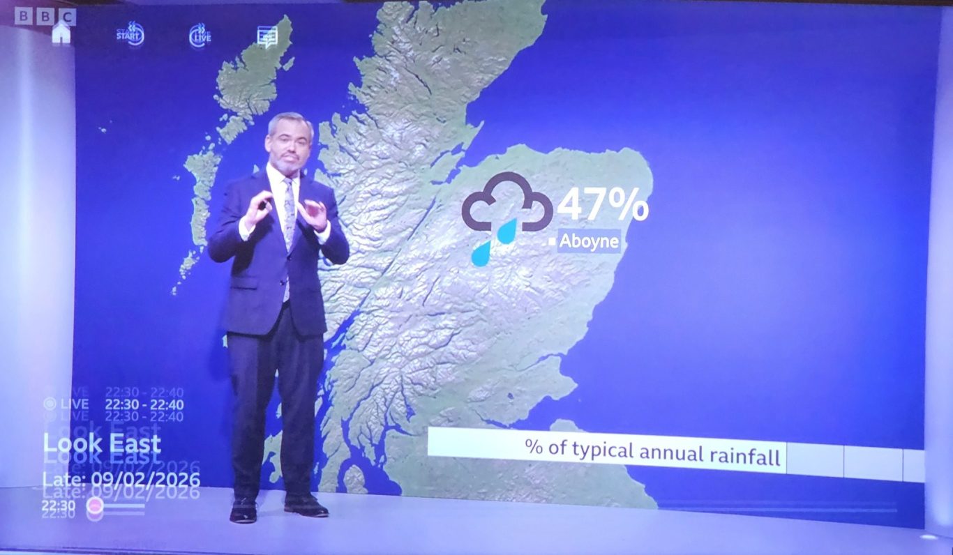 Aboyne has received close to 50% of annual rainfall already in early February 2026. ©BBC