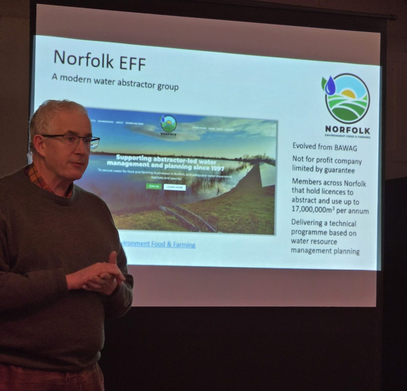 Steve Moncaster Managing Director of Norfolk Environment Food and Farming gave a presentation on the water resources planning his Water Abstractor Group is undertaking in the Broads.